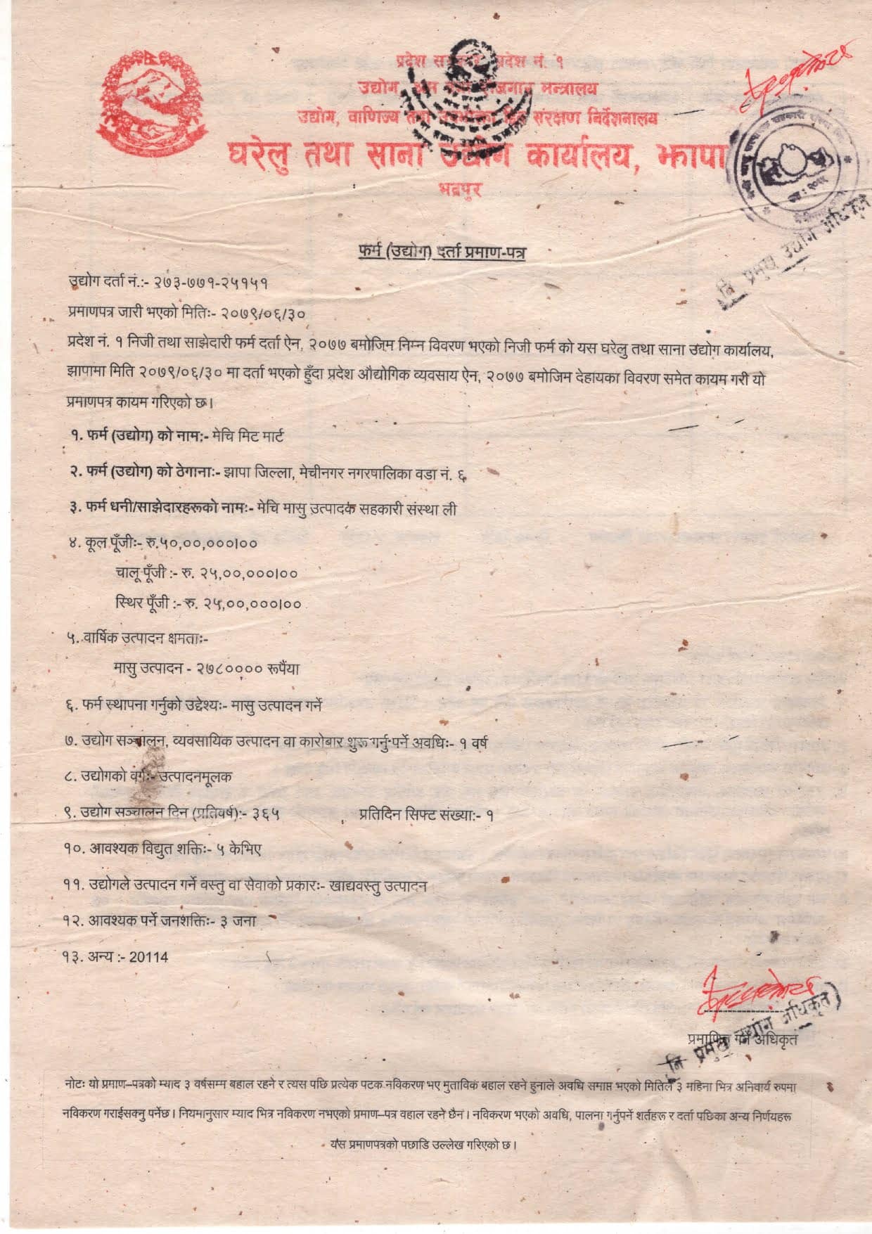 Mechi Meat Mart Gharelu Certificate Leave a Comment / By Mechi Meat Coop / २०८० चैत्र ७, बुधबार ०१:४७ Mechi Meat Mart Gharelu Certificate